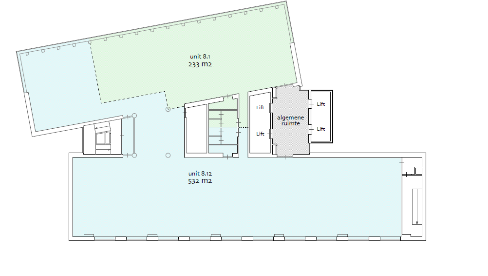8e verdieping (8.1) | circa 233,4 m² v.v.o. | per direct | € 195,00 per m² per jaar.