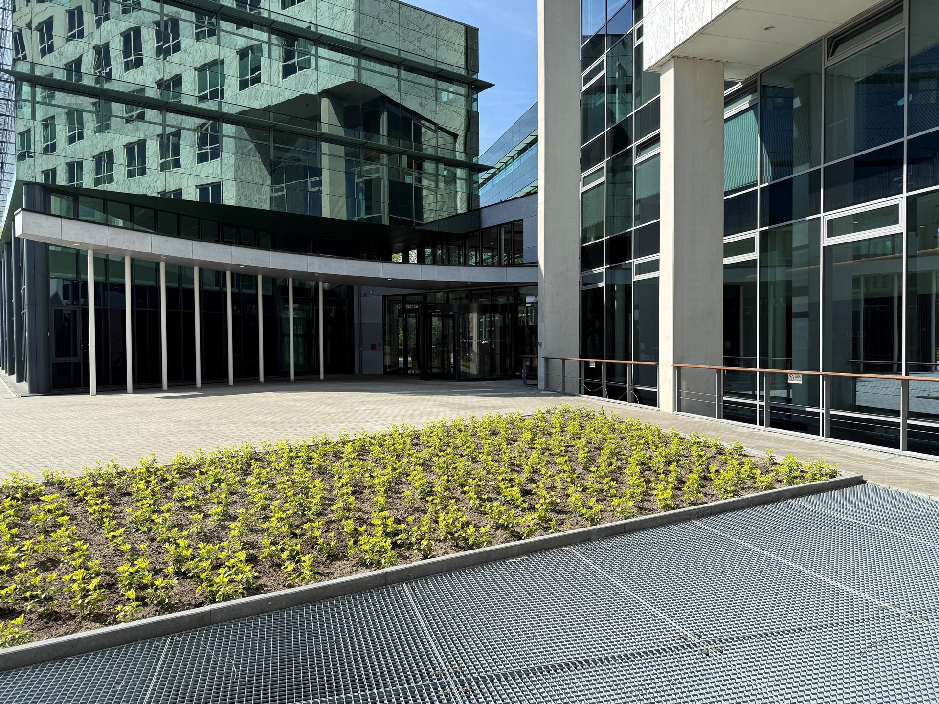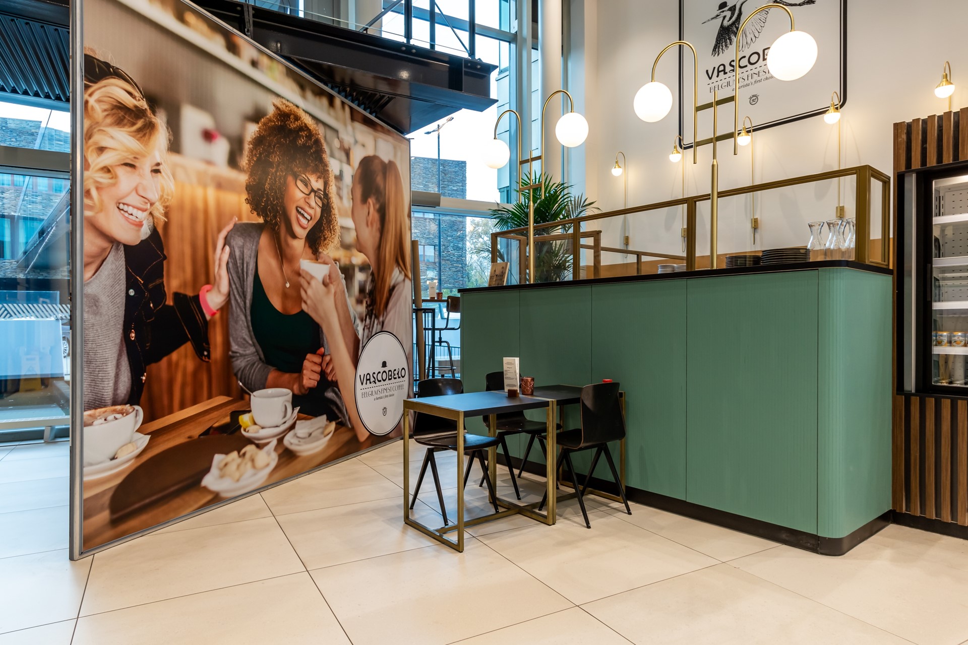 De centrale entree, welke de vier gebouwen met elkaar verbindt, is gerenoveerd tot een modern en hip entreegebied. Niet alleen zijn er op het bouwkundige vlak verbeteringen aangebracht en is de centrale entree vergroot met een nieuwe, bemande receptiebalie, er is nu ook een “V-point” koffiebar met zitplaatsen. Bij de Belgische koffiebrander Vascobelo kunt u terecht voor een heerlijk kopje koffie in alle soorten en smaken, frisdrank en natuurlijk een broodje, een croissant of een muffin.